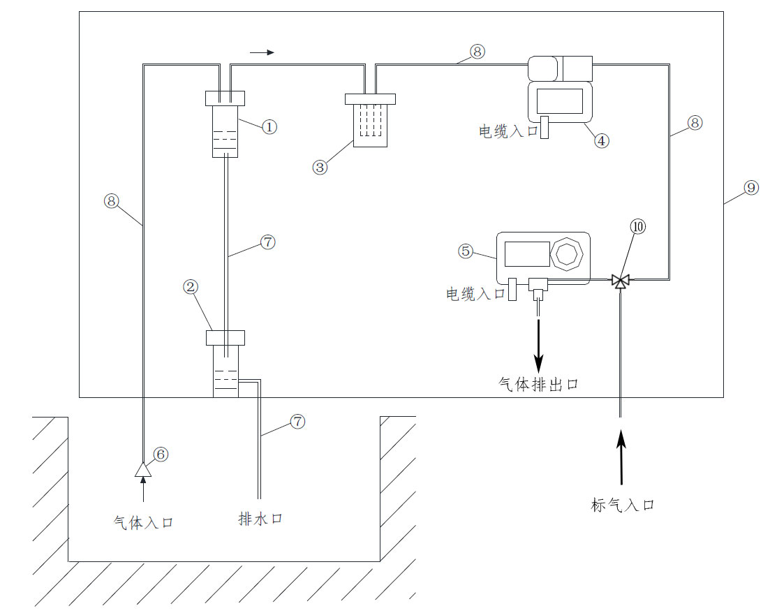 ⑨ 外保护箱:将预处理系统和气体探测器集成在箱内,避免检测系统受外界环境的干扰, 并起到防护作用;成套供货,并提供安装支架。